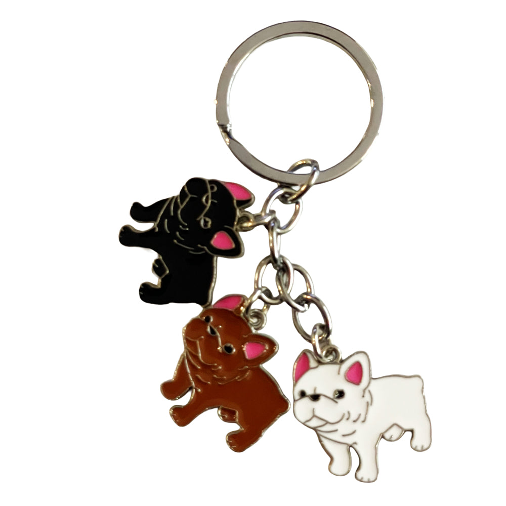 Chic and adorable, this French Bulldog keyring features three enamel charms in black, brown, and white. Perfect for dog lovers, it adds playful charm to keys or bags. A delightful gift for any occasion!